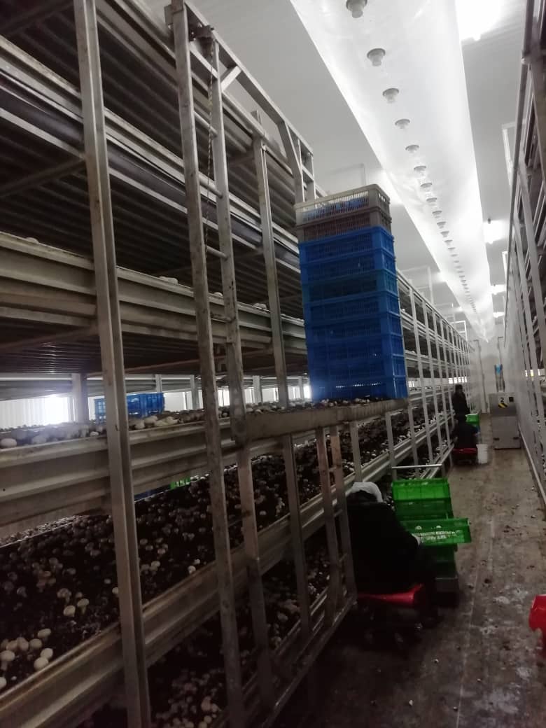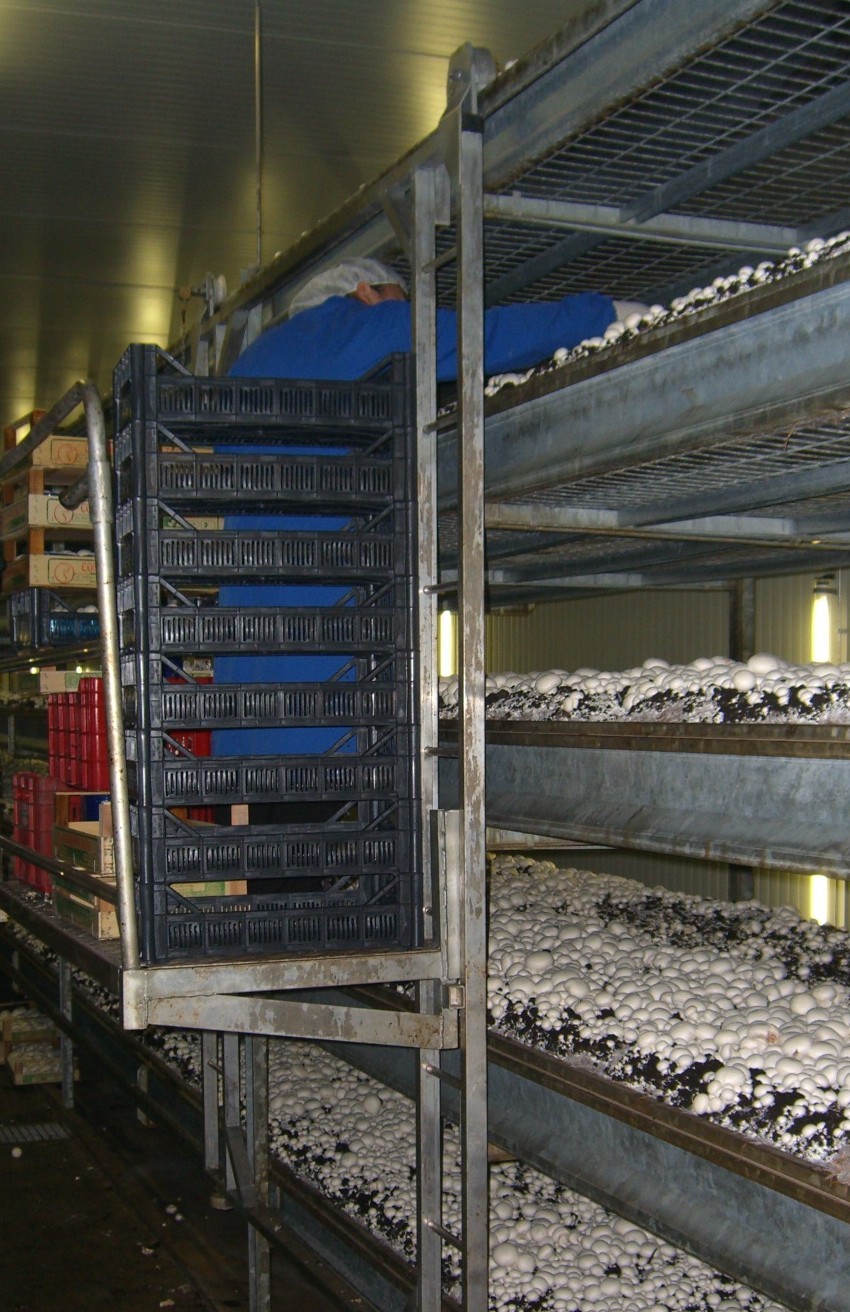 A manually operated picking lorry is used for efficient and accelerated mushroom picking. The lorry design makes it possible to pick mushrooms from every shelf.